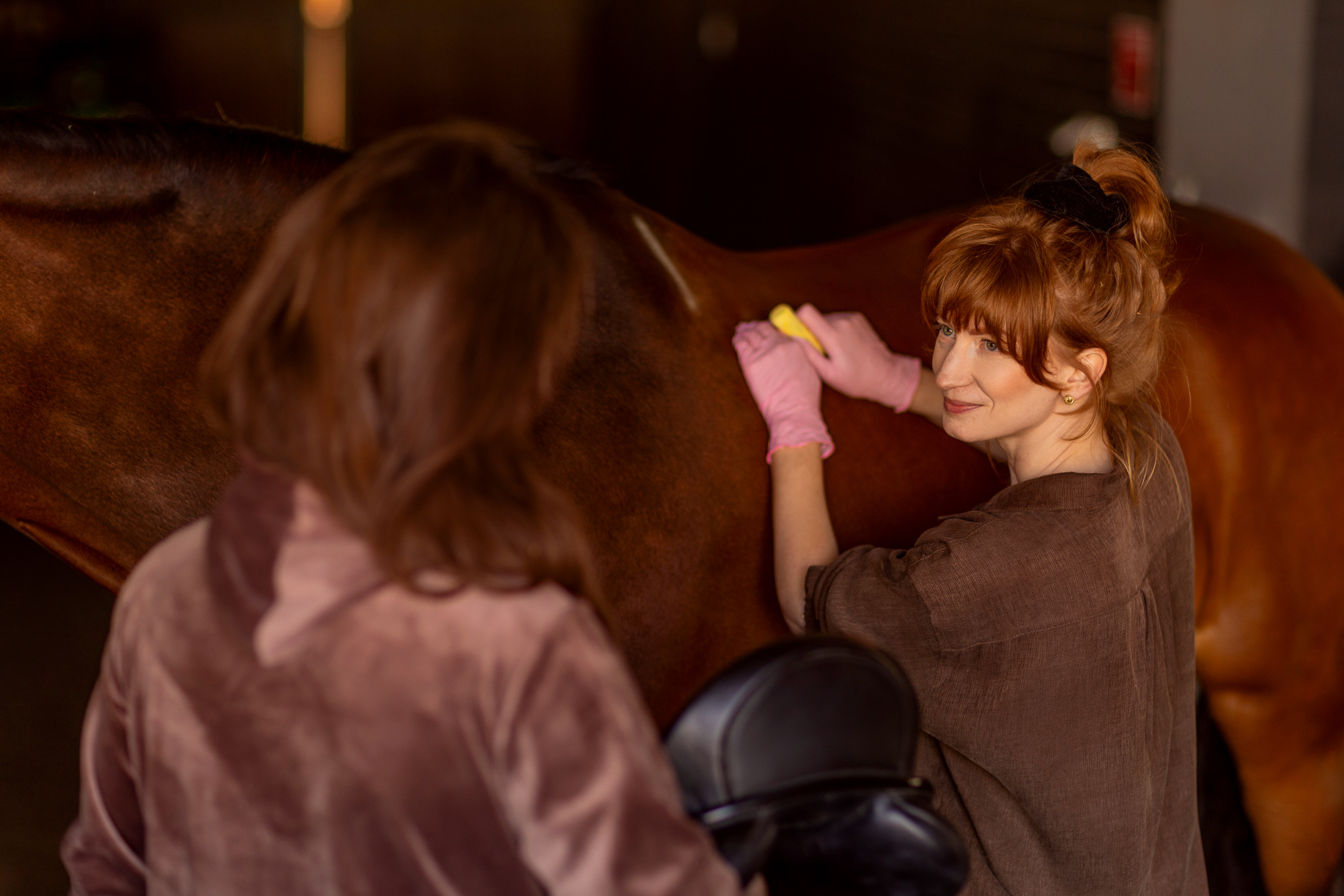 Bo skuteczny masaż to coś więcej niż teoria. Część teoretyczna mojego kursu jest dostępna online — możesz ją przerabiać wtedy, gdy masz czas i wracać do niej, ile razy chcesz. To solidna baza wiedzy: anatomia, biomechanika, techniki masażu, reakcje tkanek. Jednak masażu nie da się nauczyć wyłącznie przed ekranem. Dotyk jest podstawą tej pracy. Żeby masaż był skuteczny i bezpieczny, trzeba wyczuć struktury w ciele konia, zrozumieć napięcia i dobrać odpowiednią intensywność nacisku. Tego nie pokaże żaden film ani zdjęcie. Reakcje konia, jego oddech, spojrzenie, mikroruchy — to wszystko mówi, czy działasz właściwie. Takiej wrażliwości uczysz się tylko w kontakcie z żywym zwierzęciem. Dlatego właśnie stworzyłam kurs hybrydowy. Teoria — wygodna i dostępna zdalnie. Praktyka — tylko na żywo, z końmi. Tylko tak nauczysz się dotyku, który leczy, a nie szkodzi.